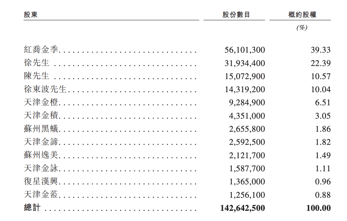 股权结构方面,IPO前,老铺黄金的股东架构中,创始人徐高明直接持股22.39%;徐东波(徐高明的儿子)直接持股10.04%;徐高明、徐东波分别拥有70%、30%的红乔金季,持股39.33%;红乔金季作为普通合伙人的天津金橙(股权激励平台),持股6.51%;徐高明、徐东波父子签署共同控制确认书,视为一致行动人,合计持股78.27%。