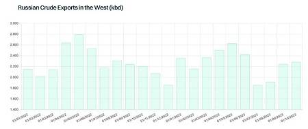 苏伊士型油轮和阿芙拉型油轮市场的利好消息是,尽管俄罗斯自愿减产,但自9月以来,俄罗斯出口的原油一直在增长。9-10月,俄罗斯原油出口量约为225万桶/日,与前两个月的平均值相比增加了近40万桶/日。