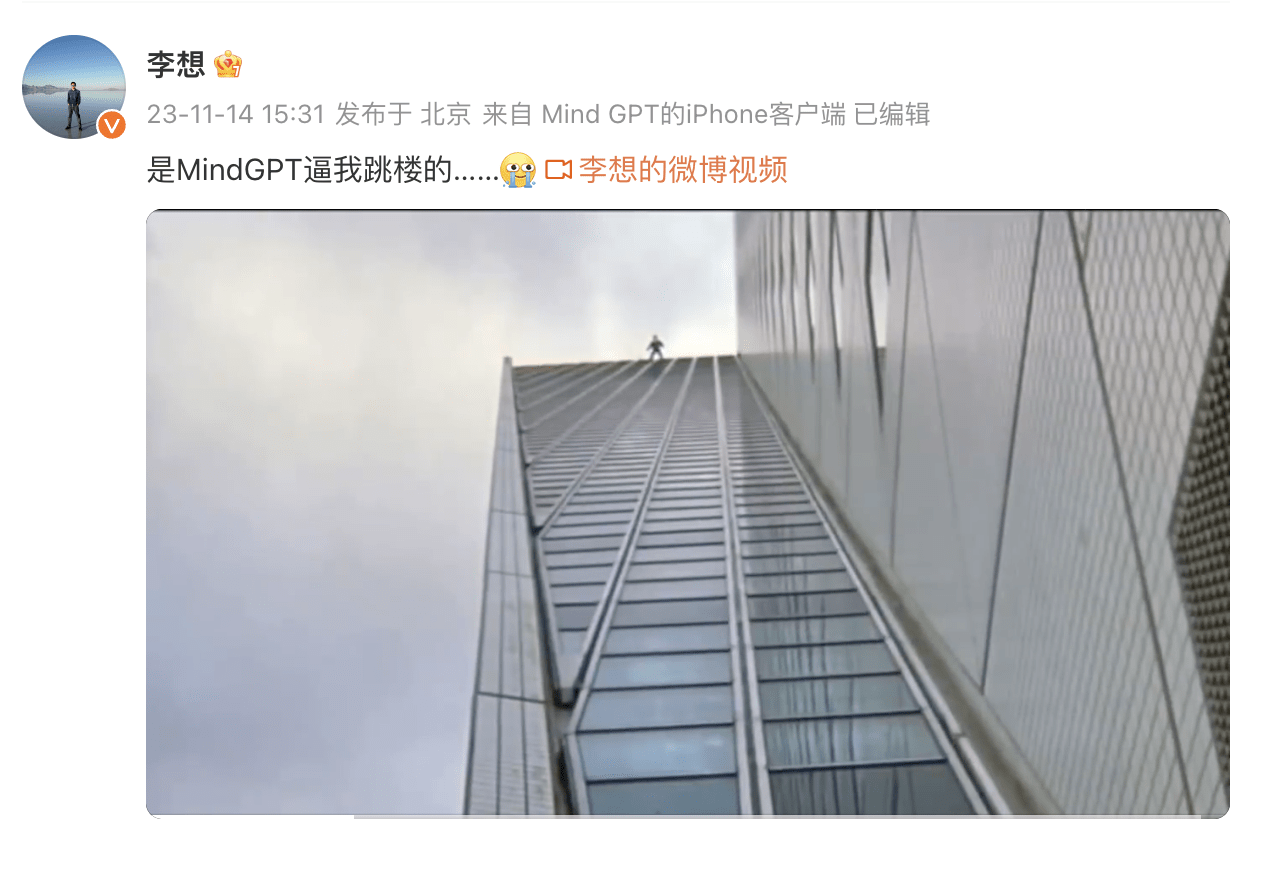 昨日,理想汽车创始人、董事长兼 CEO 李想在个人微博发布了一段 AI 换脸跳楼视频,写道:「是 MindGPT 逼我跳楼的」。