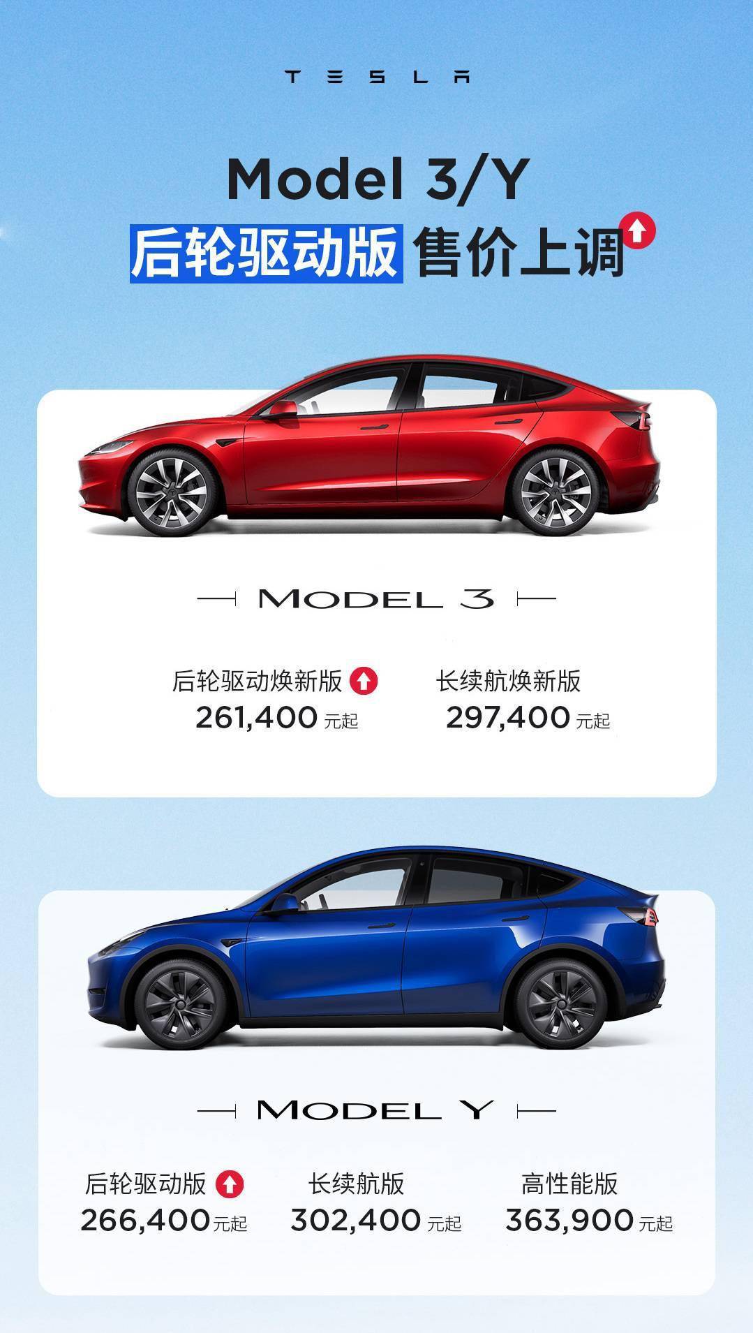 其中,Model 3 后轮驱动版上调 1500 元,调整后售价为 26.14 万元;Model Y 后轮驱动版上调 2500 元,调整后 26.64 万元。