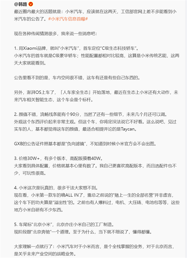 近日,汽车博主 @韩路 在微博透露小米汽车将于近日现身工信部网站。据爆料,小米首款车型定位 C 级豪华轿车,高配版接近 40 万。
