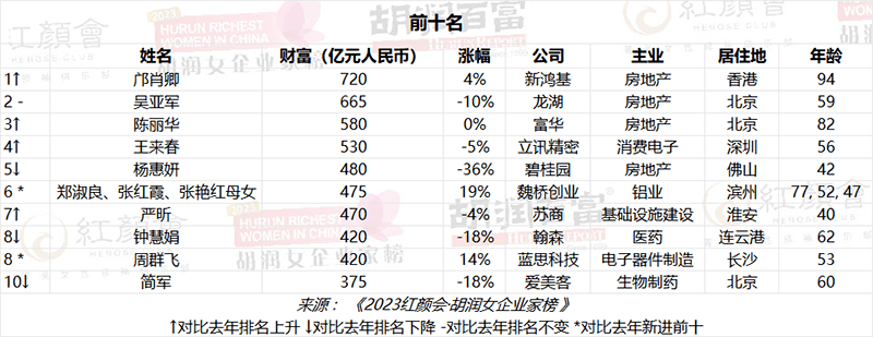 11月14日,2023胡润女企业家榜发布,列出了今年胡润百富榜上前50名女企业家。新鸿基创办人郭得胜的夫人邝肖卿财富上涨25亿元至720亿元,首次成为中国女首富,是18年来第六位中国女首富。