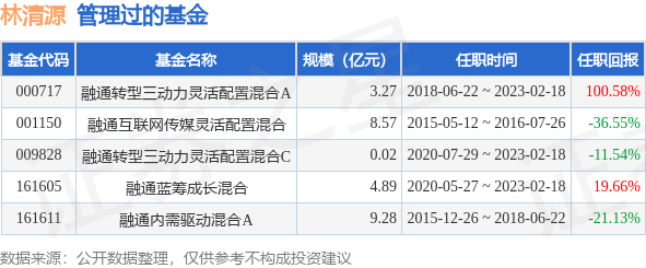 林清源先生:美国宾夕法尼亚大学系统工程硕士、上海交通大学信息工程学士,具有基金从业资格。2011年7月加入融通基金管理有限公司,历任互联网传媒行业研究员、家电行业研究员、计算机行业研究员、融通互联网传媒灵活配置混合型证券投资基金基金经理(2015年5月12日至2016年7月26日)、融通内需驱动混合型证券投资基金基金经理(2015年12月26日至2018年6月22日),现任融通转型三动力灵活配置混合型证券投资基金基金经理(2018年6月22日至2023年2月18日)。融通蓝筹成长证券投资基金基金经理(2020年5月27日至2023年2月18日)。
