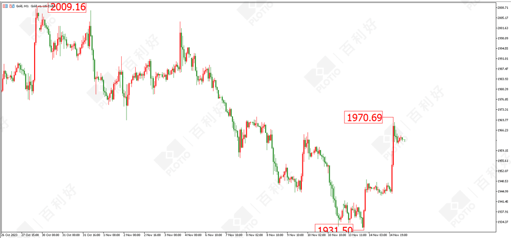 技术面:黄金昨日延续周一(11月13日)的反弹走势,最高触及1970美元的位置。短线来看,若能继续延续上涨,上方可以看向1990美元一线。