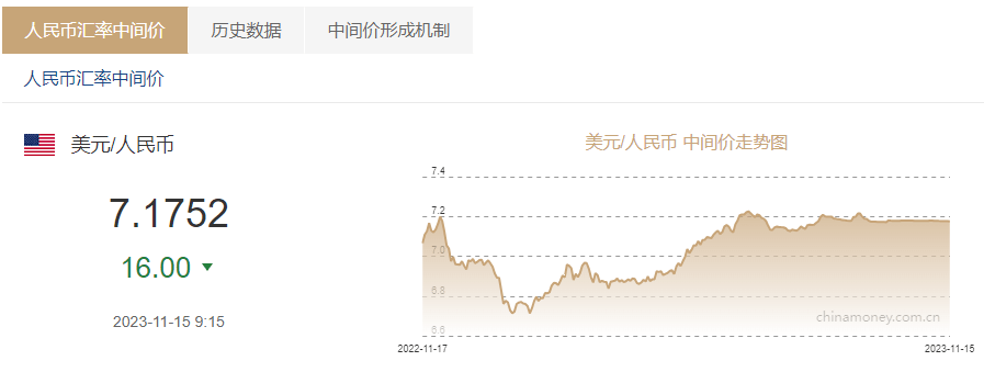 金融界11月15日消息 中国外汇交易中心显示,15日,人民币对美元中间价报7.1752,调升16个基点。