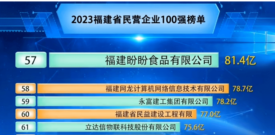 近日,福建省工商联发布了“2023福建省民营企业百强榜单”,其中显示,福建盼盼食品有限公司2022年营收为81.4亿元。