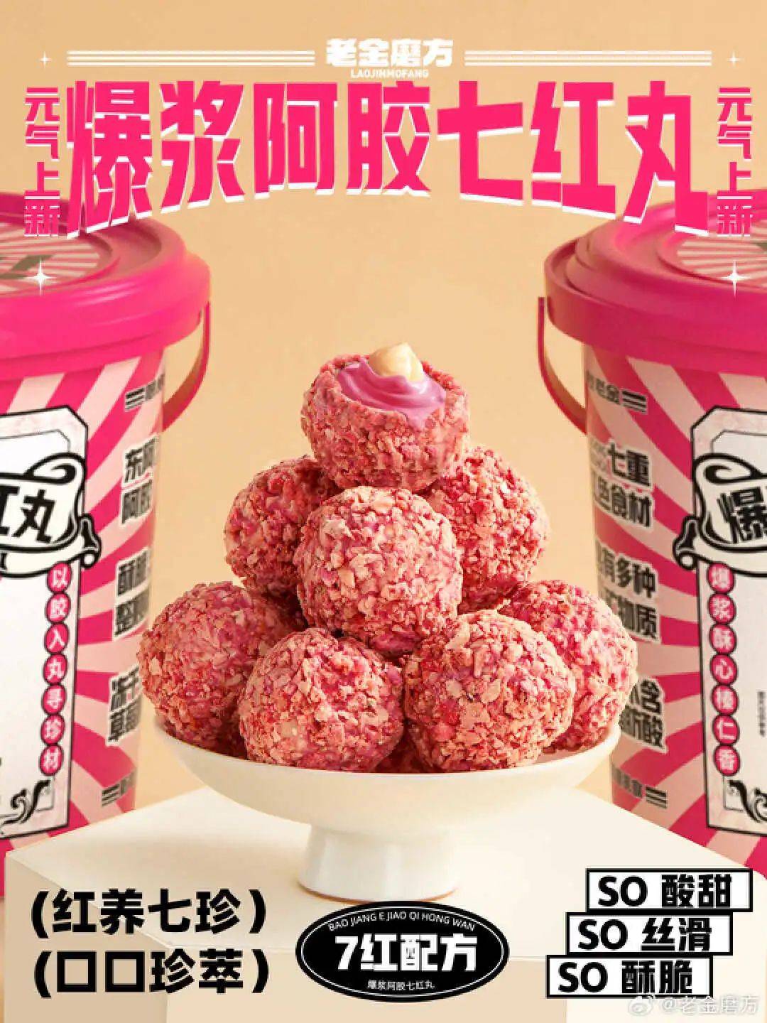 2、老金磨方推出爆浆阿胶七红丸,满满红色食材补充鲜活元气