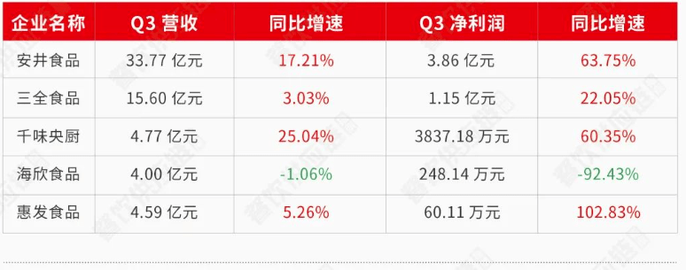 “速冻派”预制菜相关上市公司,在三季度普遍实现了营收净利双增,例如安井食品(603345.SH)、千味央厨(001215.SZ)、惠发食品(603536.SH)、三全食品(002216.SZ),相比之下,海欣食品(002702.SZ)则拖了后腿,交出了“营收净利双降”的成绩单。