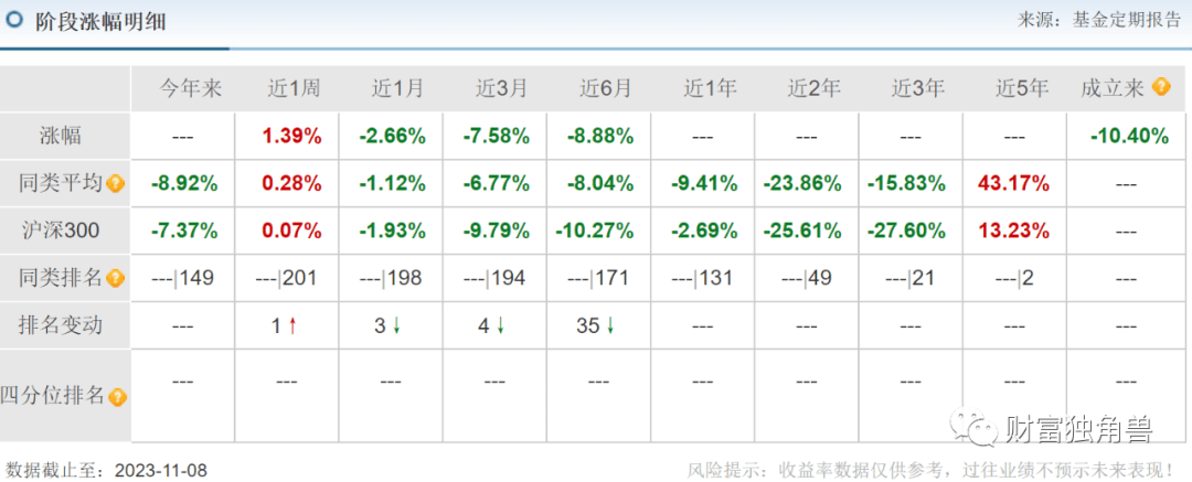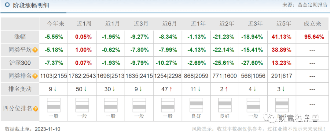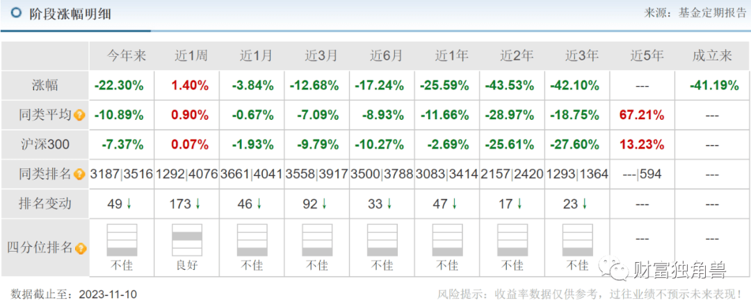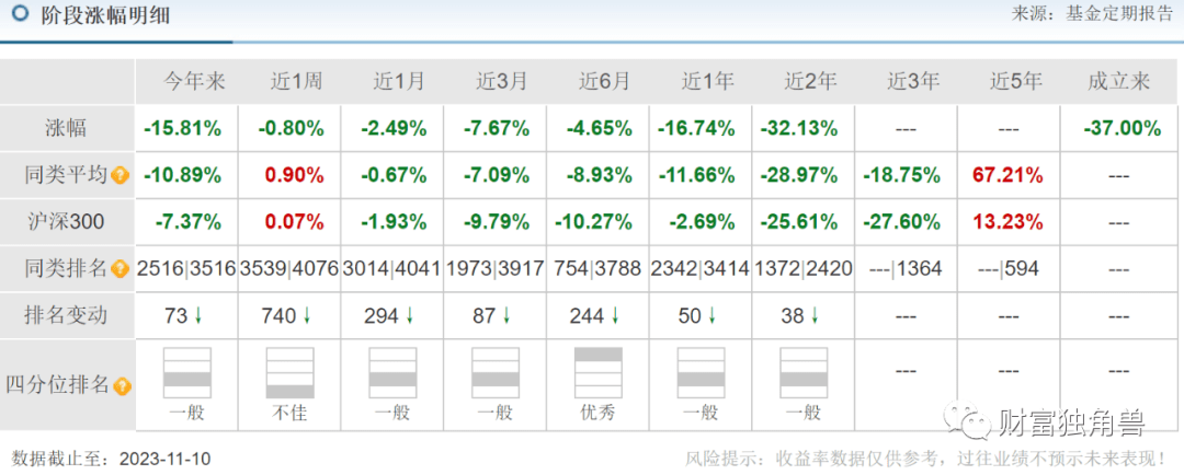 当卫星化学股价即将出现跳水之际,该基金选择于2022年2季度大举增仓持有1,671.05万股(位列首位),2022年4季度还加仓至增持2,339.47万股(位列首位)。笔者统计整个持股期间,自2021年4月1日-2023年11月10日卫星化学股价跌幅58.69%。目前卫星化学股价报收于15.65元,如果股价能止跌上涨,基金业绩才不受影响。如果股价继续下跌,那基金业绩自然还会下降。