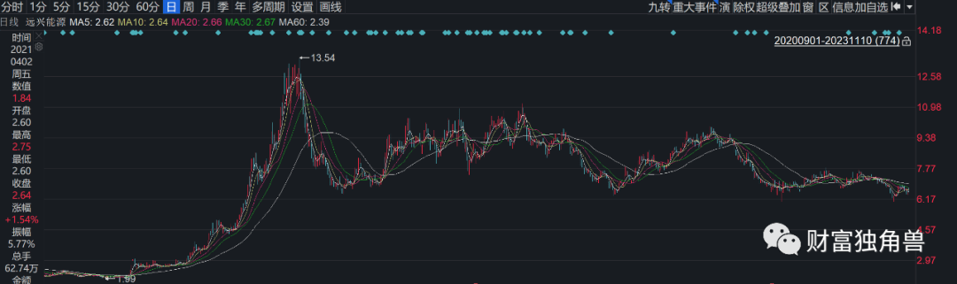 我们看看该基金到底选了什么股票?笔者发现,该基金的换股频率大概1到2个季度就会换一只股票,翻看前十大重仓股时,笔者发现,2021年3季度该基金持有远兴能源1902.49万股,而同一时间2021年3季度远兴能源股价处于每股13-13.54元最高价。