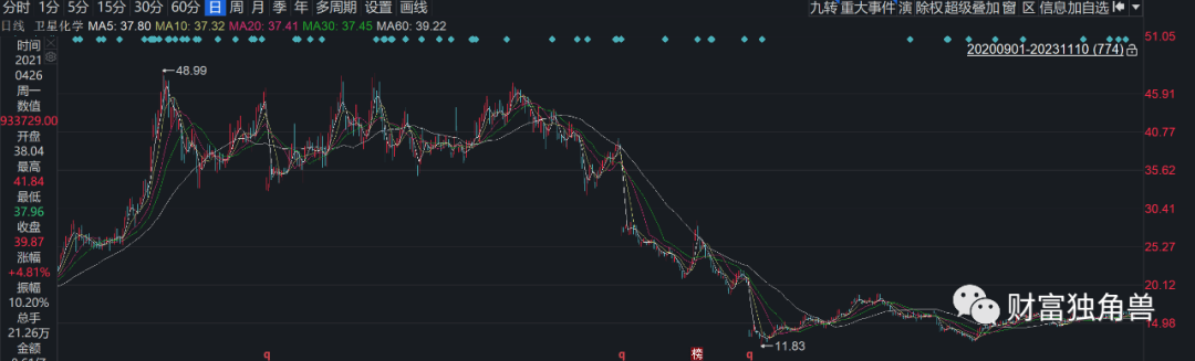 2023年1季度持有1,944.72万股(位列首位),2023年2季度持有1,819.60万股(位列首位),2023年3季度持有1,819.60万股(位列首位)。笔者回顾卫星化学股价走势发现,该基金完全是高位持股,2021年2季度正是卫星化学股价最高之时,2021年2月18日卫星化学股价创出48.89历史高位,这时候该基金于2021年2季度持有345.51万股,2021年3季度持有942.22万股,这些交易区间都处于该股股价历史高位。
