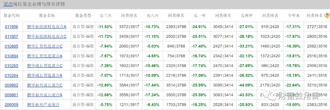 除了鹏华新兴成长混合A业绩亏损外,鹏华汇智优选混合A业绩也不理想。鹏华新兴成长混合A基金成立于2021年1月8日,基金由梁浩和朱睿共同管理,截至3季度末基金规模44.98亿元。截至11月10日基金单位净值0.6300,自基金成立来收益率-37%,今年来收益率-15.81%,近3月来收益率-7.63%,近6月来收益率-4.65%,近1年来收益率-16.74%,近2年来收益率-32.13%。