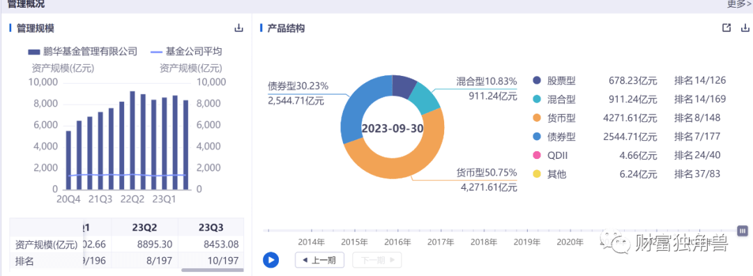 从产品结构方面看,鹏华基金固收类业务占比8成,这对于一家券商系基金公司来说,其结构较为失衡。从鹏华基金产品结构上看,货币型基金仍占大头,货币基金规模4271.61亿元,占比50.75%;债券型基金规模2544.71亿元,占比30.23%;混合型规模911.24亿元,占比10.83%。