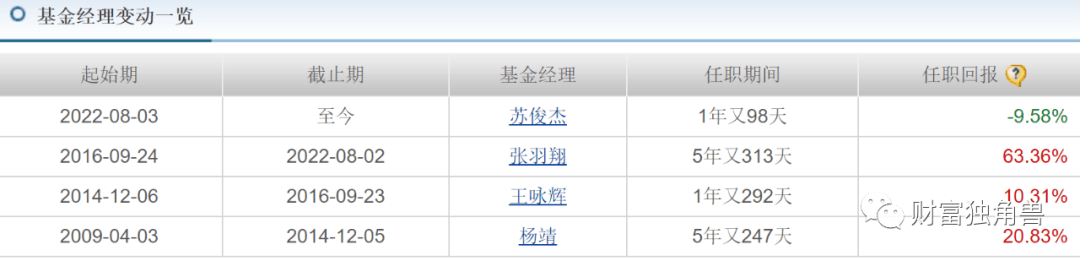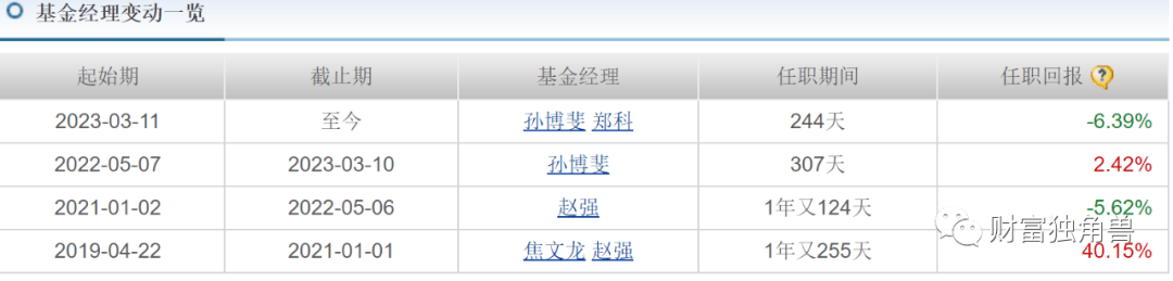 据天天基金网显示,基金成立初期由焦文龙和赵强共同管理,其管理的1年又255天,任职回报40.15%;赵强管理的1年又124天,任职回报-5.62%;之后又由孙博斐管理了307天,任职回报2.42%;自2023年3月11日至今由孙博斐和郑科共同管理,任职244天,任职回报-6.39%。