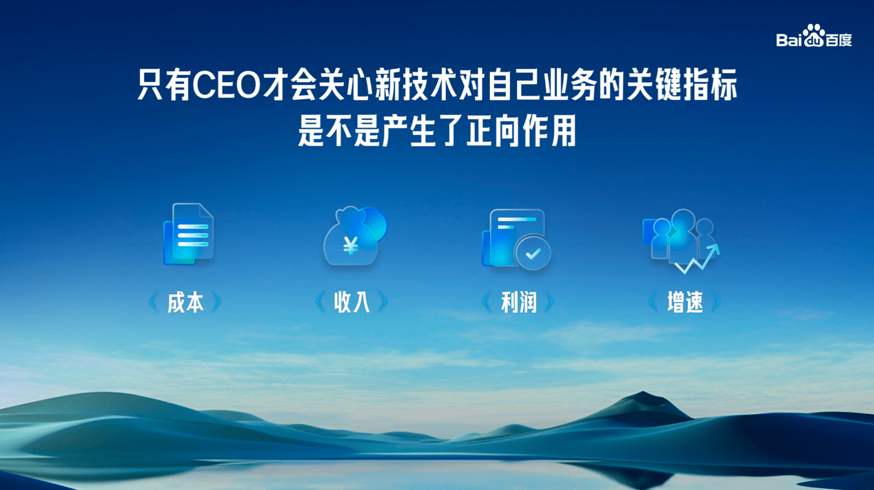 “为什么需要一把手来驱动?因为只有CEO才会关心新技术对自己业务的关键指标是不是产生了正向作用。”李彦宏表示,大模型有没有对互联网公司的DAU、时长、用户留存这些指标产生正向影响,有没有对企业的收入、利润、成本产生影响,才是问题的本质。