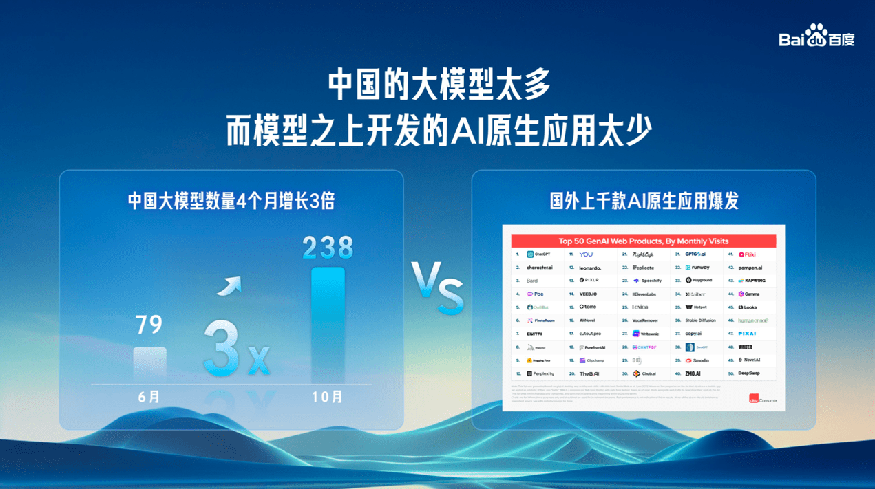 而对于国内,他分析说,截至10月份,国内已经发布了238个大模型,相较于6月份的79个,在四个月内增长三倍,但相较于国外的几十基础大模型和上千个AI原生应用来看,国内AI原生应用数量却很少。