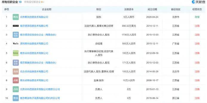 在任职的企业中,只剩注册资本为5万的北京希尚信息技术有限公司还存续,其余9家也全部注销。
