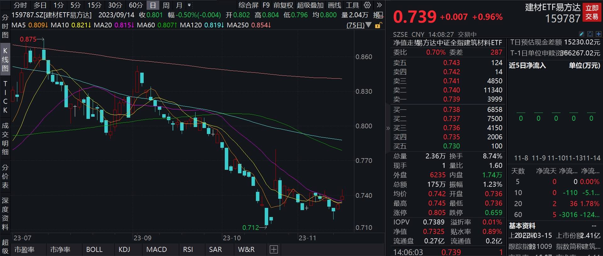 截至2023年11月15日14:08,建材ETF易方达(159787)盘中涨超1%,现涨0.96%,报0.739元,换手率达8.74%,市场交投活跃。
