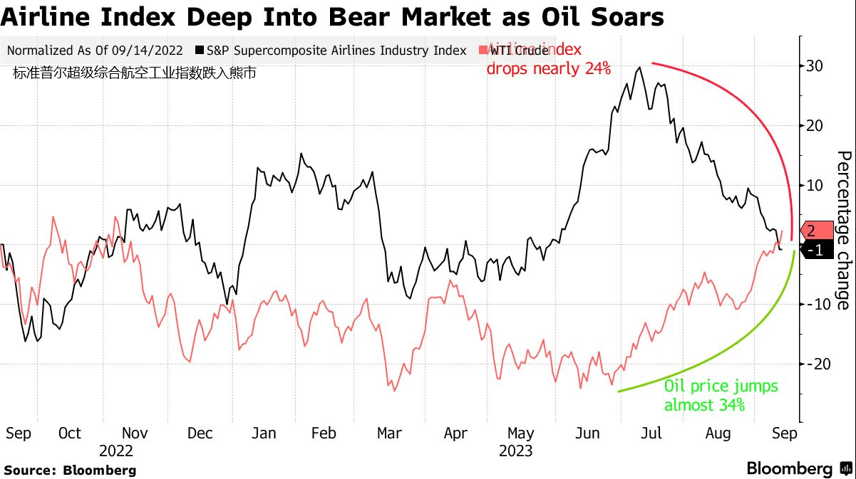 随着油价在过去3个月的上涨,10月份的时候,衡量航空股的标准普尔超级综合航空工业指数跌入熊市,延续了自7月中旬触及的最近高点以来快速下跌的趋势。美国数大航空公司也下调了盈利预期,主要受累于油价突然上涨、劳动力成本上升和国内旅游需求疲软。
