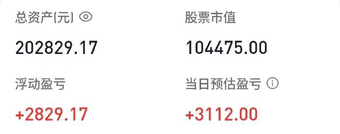 今天股市涨了1.31%,老胡真是高兴。我个人持仓的股票上涨大约3.1%,目前实现盈利2829.17元,跑赢了今天的A股涨幅,这让我尤其高兴。不管我今后是否会跌亏,但是我实现了迅速而稳妥的入市,第一笔10万元全都买成了股票,并已进入盈利状态,补的10万元我想等大盘绿了再搞“逢低买入”。只要股市接下来是震荡上行的,我就应该不会亏。
