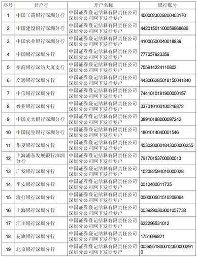 注:以上账户信息如有更新以中国结算网站公布信息为准。可登录“http://www.chinaclear.cn-服务支持-业务资料-银行账户信息表-中国结算深圳分公司网下发行专户信息表”查询。