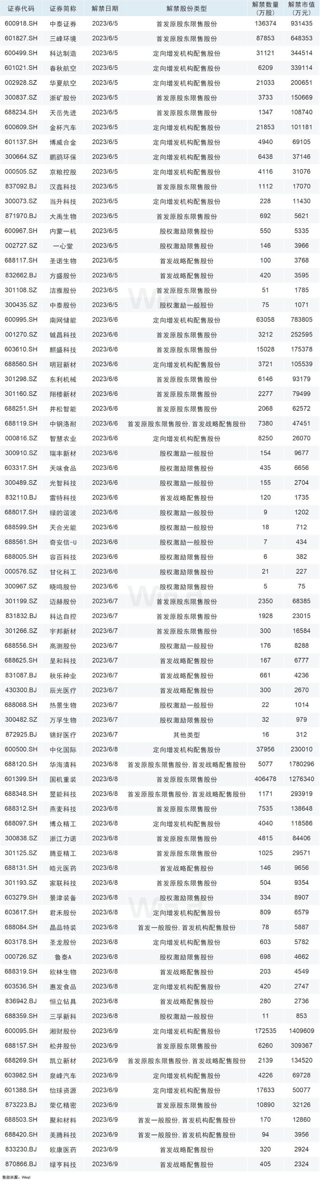 从解禁市值来看,6月8日是解禁高峰期,19家公司解禁市值合计401.35亿元,占下周解禁规模的37.03%。按6月2日收盘价计算,解禁市值居前三位的是:华海清科(178.03亿元)、国机重装(127.63亿元)、昱能科技(29.39亿元)。从个股的解禁量看,解禁股数居前三位的是:国机重装(40.65亿股)、燕麦科技(0.75亿股)、华海清科(0.51亿股)。