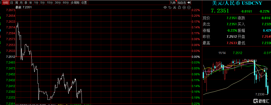 日内,在岸、离岸人民币汇率双双升破7.23,为8月中旬以来新高。