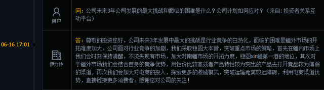 6月中旬,伊力特在回答投资者问答时,也提到了行业竞争白热化,疆外市场拓展难度加大,公司将在产品和渠道上持续发力。