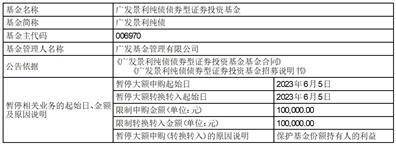 广发基金管理有限公司(以下简称“本公司”)决定自2023年6月5日起,广发景利纯债债券型证券投资基金(以下简称“本基金”)调整机构投资者单日单个基金账户申购及转换转入本基金的业务限额为100,000.00元。即如机构投资者单日单个基金账户申购及转换转入本基金的申请金额大于100,000.00元,则100,000.00元确认申购成功,超过100,000.00元(不含)金额的部分将有权确认失败;如机构投资者单日单个基金账户多笔累计申购及转换转入本基金的金额大于100,000.00元,按申请金额从大到小排序,本公司将逐笔累加至100,000.00元的申请确认成功,其余超出部分的申请金额本公司有权确认失败。