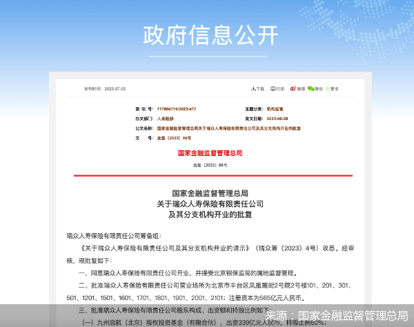 北京商报讯(记者 岳品瑜 胡永新)7月3日,国家金融监督管理总局发布关于瑞众人寿保险有限责任公司(以下简称“瑞众人寿”)及其分支机构开业的批复显示,同意瑞众人寿开业,并接受北京银保监局的属地监督管理。