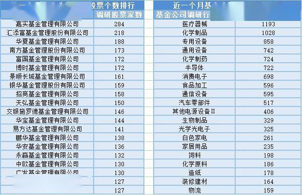 近一个月(10月15日-11月15日),嘉实基金参与公司调研的数量最多,共调研284家上市公司,然后调研较为活跃的还有汇添富基金、华夏基金、富国基金,分别调研218家、188家、173家上市公司;从调研行业上来看,基金公司对医疗器械行业的上市公司调研次数最多,共有1193次,其次是化学制品行业,基金公司调研了1028次。