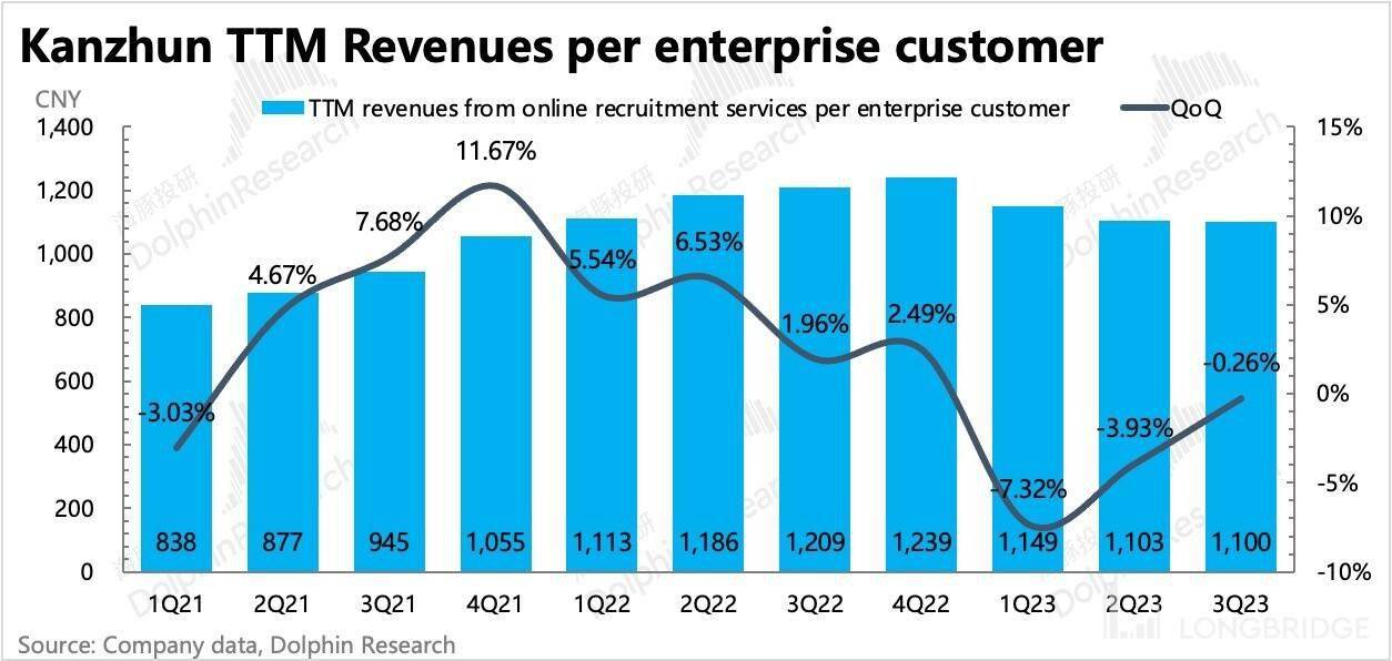 首先,付费用户增加离不开 BOSS 直聘扩展自己更灵活付费的招聘工具,这种情况下单用户付费 ARPU 降低,付费渗透率会提升。不过三季度平均单个企业的 TTM 付费环比下降速度在放缓。