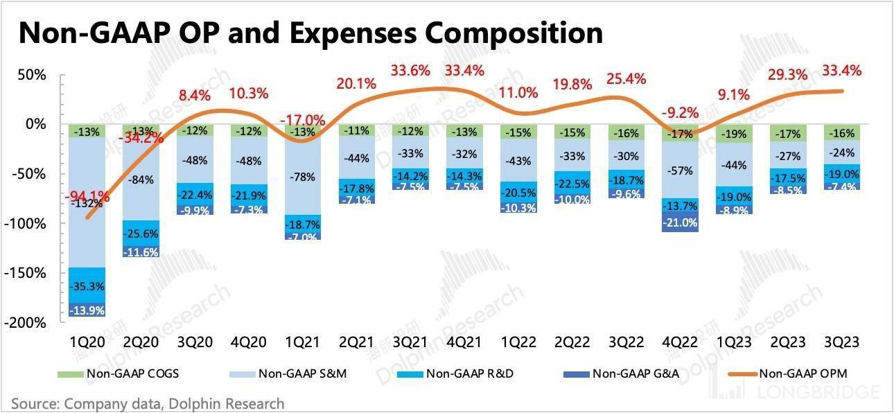 电话会上,公司对自己的长期 Non-GAAP 经营利润率目标维持在 40% 的水平,目前三季度已经达到了 33.4%。调整的 SBC 预计占收入比重 16-18 个点,如果 SBC 比例保持不变,也就是经营利润率达到 22-24%,这个盈利能力已经算是相当优秀的了。