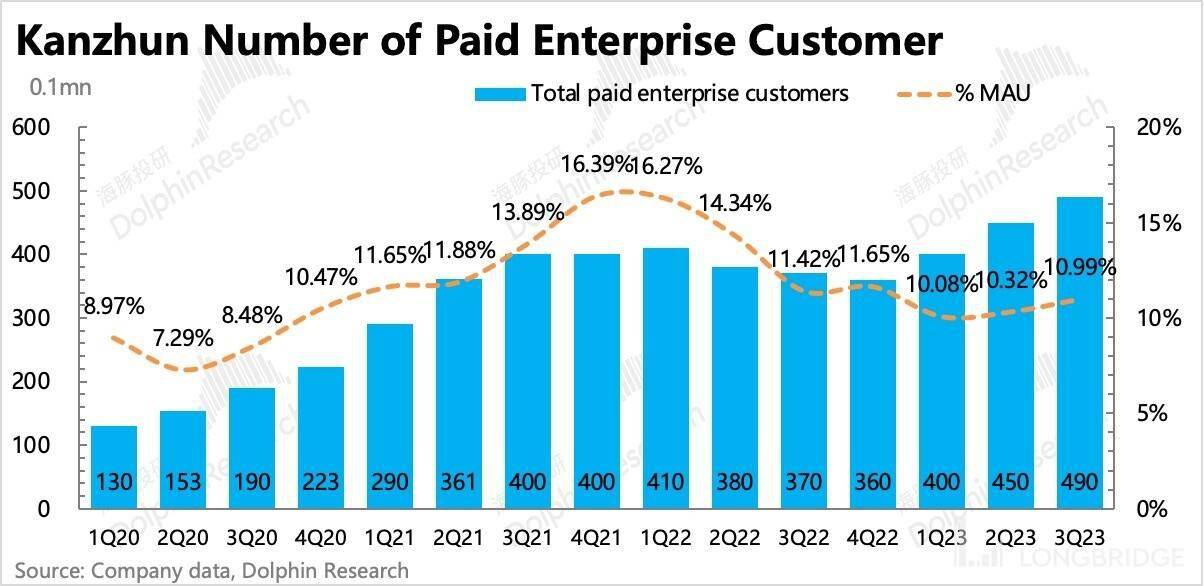 三季度付费企业用户继续环比增加 40 万户,虽然本身也是旺季,但连续三个季度的付费客户增加,似乎与当下的大环境感受相反。但我们认为,相比于一、二季度的付费增加,可能三季度释放出更关键的信号。