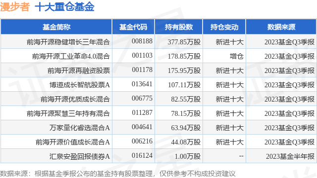 根据2023基金Q3季报公募基金重仓股数据,重仓该股的公募基金共8家,其中持有数量最多的公募基金为前海开源稳健增长三年混合。前海开源稳健增长三年混合目前规模为13.71亿元,最新净值0.8138(11月14日),较上一交易日上涨0.53%,近一年下跌5.28%。该公募基金现任基金经理为邱杰。邱杰在任的基金产品包括:前海开源再融资股票,管理时间为2015年5月18日至今,期间收益率为88.34%;前海开源恒远灵活配置混合,管理时间为2016年3月28日至今,期间收益率为86.92%;前海开源工业革命4.0混合,管理时间为2018年5月7日至今,期间收益率为64.92%;前海开源价值成长混合A,管理时间为2018年9月19日至今,期间收益率为52.79%。