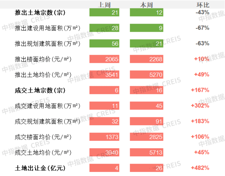 本周,20城市商办土地大部分指标有所上升。全国重点20城中杭州、长沙、南京、上海、福州、程度、苏州、合肥等8个城市共推出12宗商办用地,推出商办建设用地面积9万㎡,环比上周减少67%。成交方面,20城中杭州、长沙、南京、上海、福州、程度、苏州、合肥等8个共成交16宗商办用地,成交建设用地面积45万㎡,环比上周增长302%,成交土地出让金26亿元,环比上周增长482%。一线城市成交1宗。