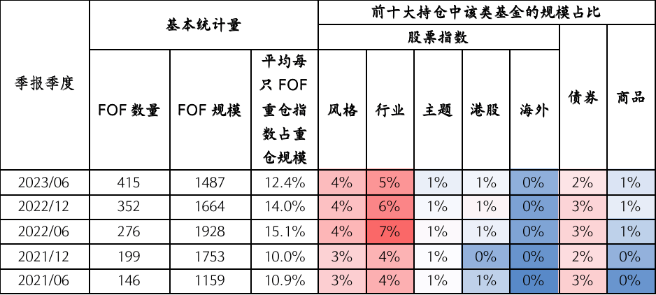 另一方面,FOF基金底层指数产品类型覆盖日趋全面(见表3)。我们统计2021年以来各只FOF基金重仓指数基金的分布,以行业指数型基金居多,FOF前十大持仓基金中普遍持有行业类股票指数基金达到5%以上,而宽基或风格股票指数基金略少,仅为3-4%,债券类和商品类指数基金持仓在不同季度中往往仅占FOF持仓基金规模的1-2%,而持仓其余类型指数基金更少。