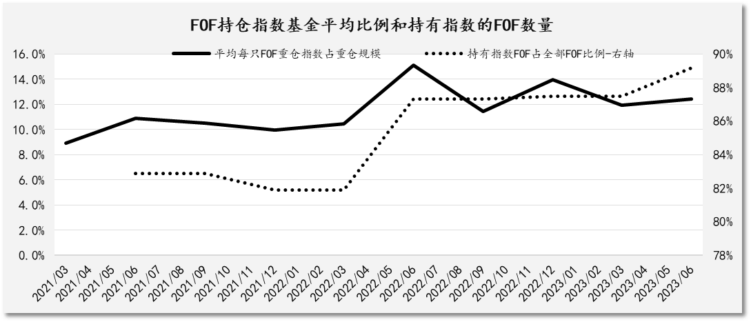 一方面,指数化投资契合FOF投资理念,强调分散化、长期持有。从公募FOF诞生伊始,指数化投资就是FOF基金不可或缺的投资手段,持有指数基金的FOF基金数量占比从2021年初的82%逐渐上升到2023年6月底的近90%,平均每只FOF基金重仓指数基金占所有重仓基金规模比例也从2021年初的8%上升50%达到2023年6月底的12%。