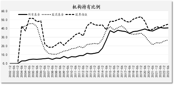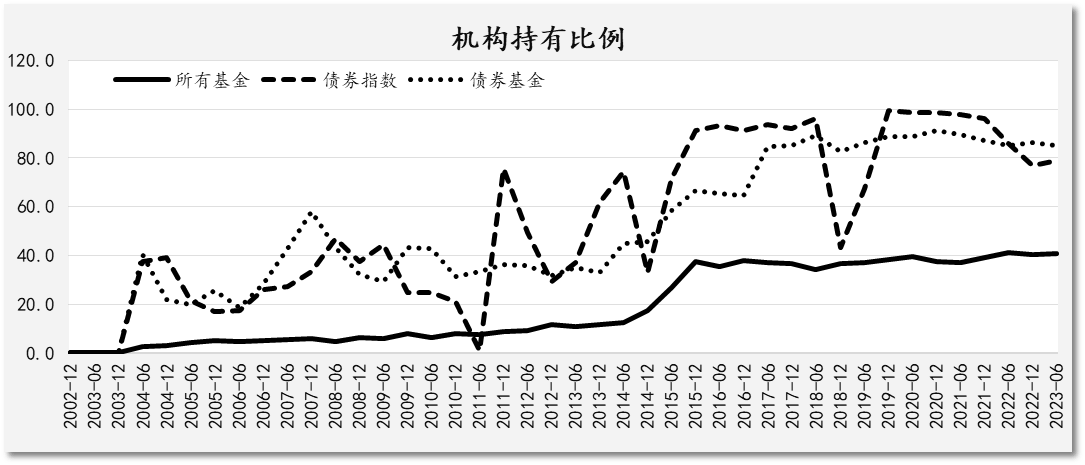 从机构持有国内指数基金的比例来看(见图3),2014年之后机构资金在国内基金资金来源中占比显著升高。分策略类型来看,股票指数基金的机构资金占比在2007年之后经历了持续提高的过程,始终稳定高于普通股票型或混合型基金的机构资金占比;然而,债券指数基金并未体现出这一特征,机构持仓比率并未稳定高于普通债券基金,而且波动较大。可见当前指数化投资逐渐成为国内机构投资的主流方向,但投资结构差异较大,机构持仓比例仍不稳定。