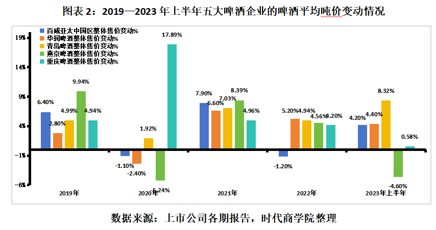 据各企业定期报告计算,除2020年外,2019以来,我国五大啤酒企业的啤酒平均吨价整体呈上升趋势,尤其是青岛啤酒、重庆啤酒,即使在2020年疫情冲击下,其当年的啤酒平均吨价仍分别上涨1.92%、17.89%。