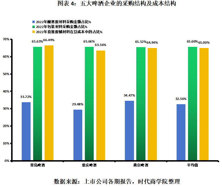 2022年年报显示,燕京啤酒采购麦芽、大米两项酿酒原材料的金额占当期主要采购内容金额的比例为23.58%、10.90%,合计比例为34.48%;采购纸箱、易拉罐、玻璃瓶新瓶三项包装材料的金额占当期主要采购内容金额的比例分别为14.40%、25.51%、25.61%,合计比例为65.52%。