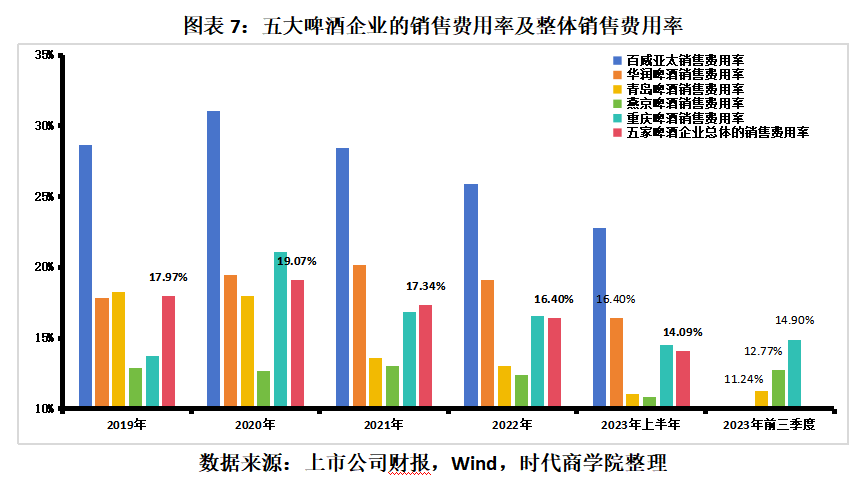 以五大啤酒企业的销售费用总额除当期的营业收入总额,核算五大啤酒企业整体的销售费用率。2019—2023年上半年,五大啤酒企业整体销售费用率分别为17.97%、19.07%、17.34%、16.40%、14.09%,2023年上半年较2019年下滑了3.88个百分点。