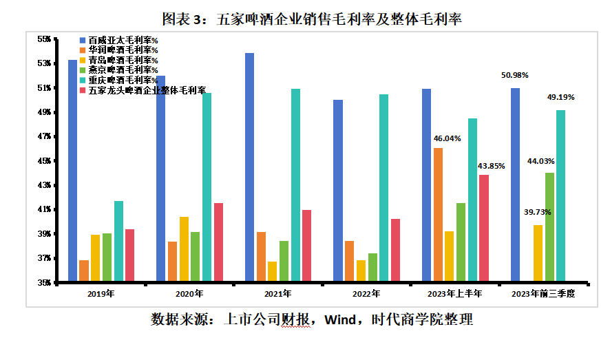 根据五大啤酒企业的合计营业收入及毛利润计算,2019—2023年上半年,五大啤酒企业的整体销售毛利率分别为38.37%、41.56%、40.96%、40.22%、43.85%,2023年上半年整体销售毛利率较2019年提升5.48个百分点。
