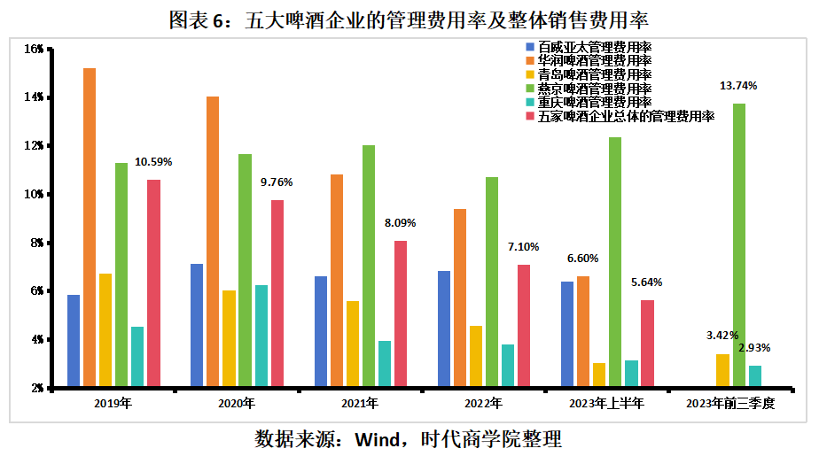 具体来看,据Wind数据,2023年上半年,青岛啤酒、重庆啤酒、百威亚太、华润啤酒、燕京啤酒的管理费用率分别为3.03%、3.17%、6.38%、6.60%、12.37%,相较于2019年的管理费用率分别下滑3.69个百分点、下滑1.36个百分点、上升0.55个百分点、下滑8.6个百分点、上升1.08个百分点。其中,2023年上半年,青岛啤酒管理费用率最低,而华润啤酒期间的管理费用率下降幅度最大。