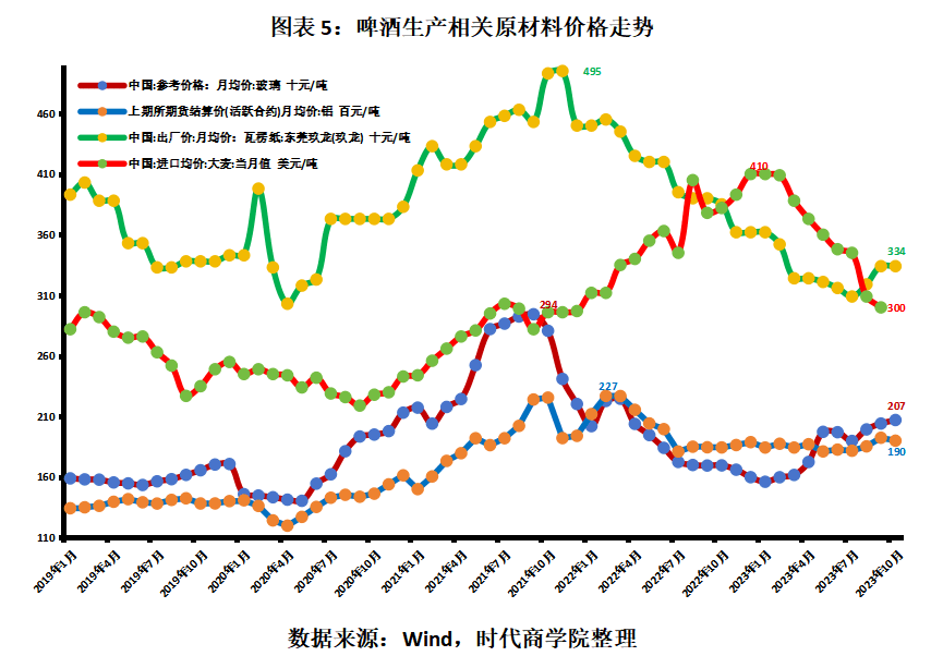 Wind数据显示,包装材料中瓦楞纸、玻璃、铝的价格高点分别在2021年11月、2021年9月、2022年2月,后续随着上游供需格局的改变均进入下行周期。2023年10月,百川盈孚公布的玻璃中国市场参考价格为2071元/吨,相对2021年9月的价格最高点2943元/吨下滑了29.63%;东莞玖龙瓦楞纸的出厂价月均价则从2021年11月的最高点4950元/吨下滑至2023年10月的3340元/吨,价格下滑幅度为32.52%;而易拉罐制造原材料铝的期货活跃合约结算价月均价则从2.27万元/吨下滑至2023年10月的1.90万元/吨,价格下滑幅度为16.30%。