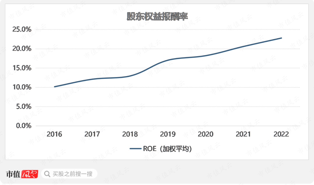 随着净利率的提升,公司ROE(加权平均)也保持稳步提升,2022年达到22.8%。