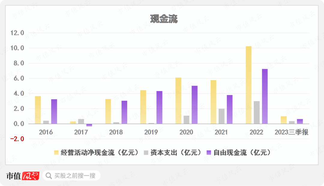 现金流方面总体表现良好。2016年至2022年,累计自由现金流为26.3亿元。