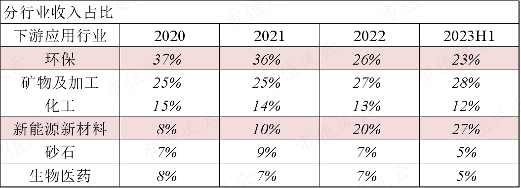 近几年公司产品在新能源、新材料等领域得到广泛应用,相关领域营收占比持续提升,对应的,环保领域营收占比持续下降。