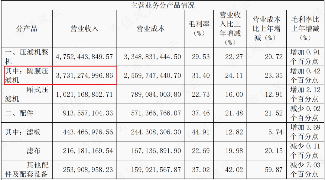 公司产品包括压滤机整机(过滤成套装备)和配件,2022年营收占比分别为84%、16%。整机中以隔膜压滤机为主,高端产品占比较高。