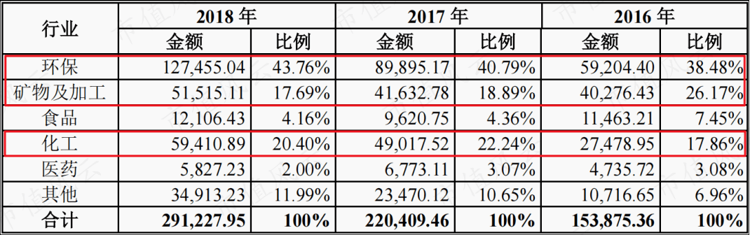 2016-2018年,环保、化工、矿物及加工行业贡献主要营收,其中环保行业占比在40%左右。